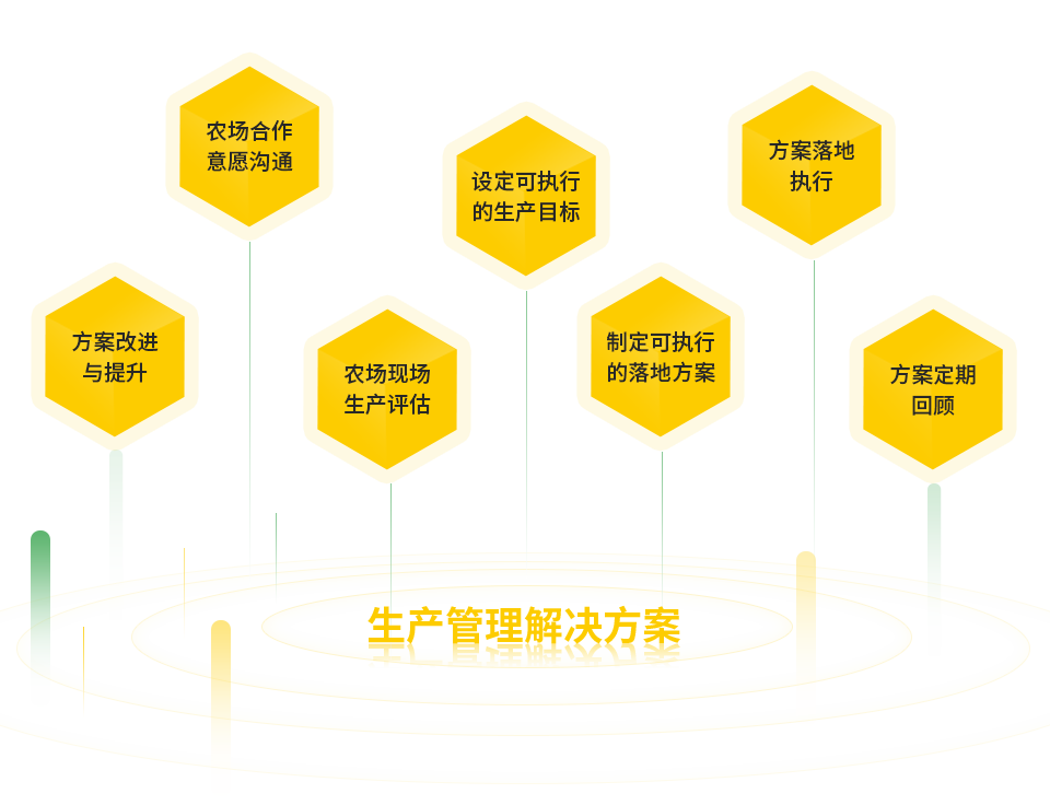 農(nóng)場(chǎng)合作意愿溝通、農(nóng)場(chǎng)現(xiàn)場(chǎng)生產(chǎn)評(píng)估、設(shè)定可執(zhí)行的生產(chǎn)目標(biāo)、制定可執(zhí)行的落地方案、方案落地執(zhí)行、方案定期回顧、方案改進(jìn)與提升,